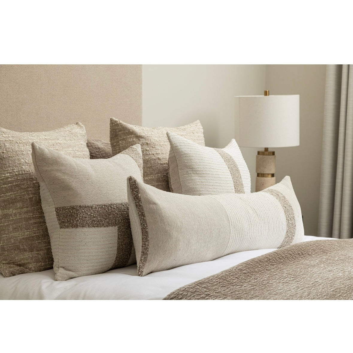 With its clean lines and soft contrast textures, the Reeve Cushion offers a modern take on neutral styling. Featuring a stitched panel design with raised boucle stripes in warm ivory and taupe tones, it’s the perfect accent for beds or sofas seeking calm, contemporary appeal.