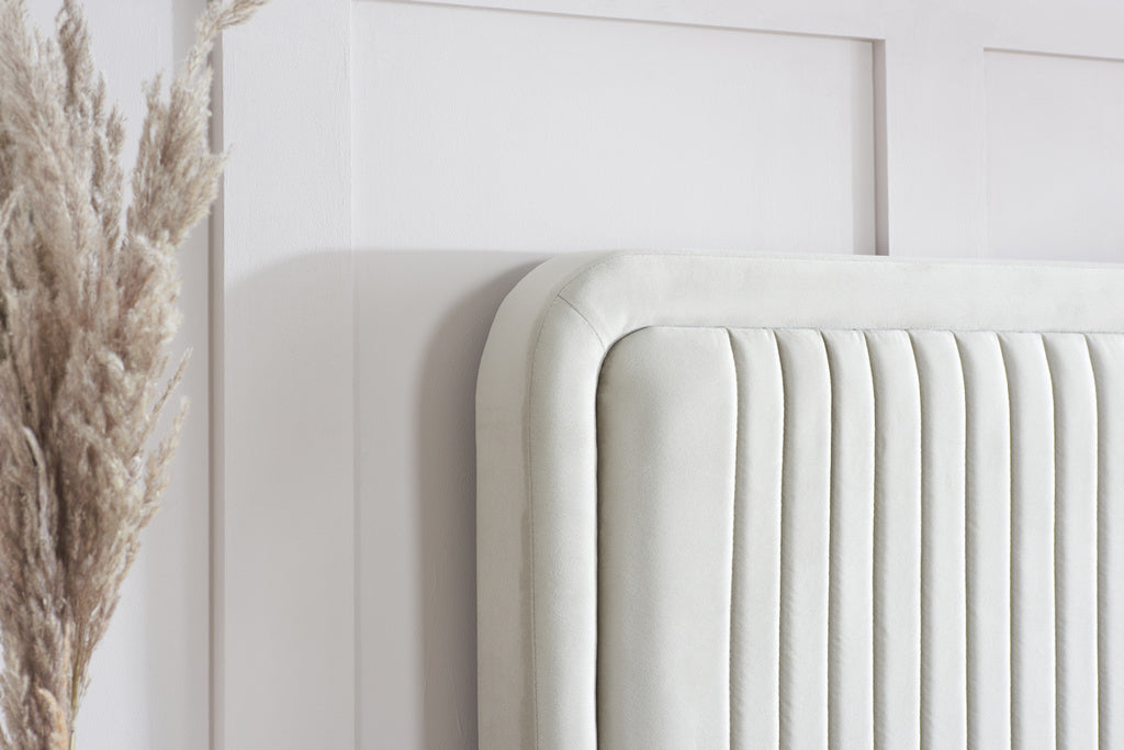 Crafted in a warm stone fabric, this bed is the epitome of sophistication. The headboard, with its vertical channel detailing, offers a contemporary twist on classic design, providing both visual and tactile allure.