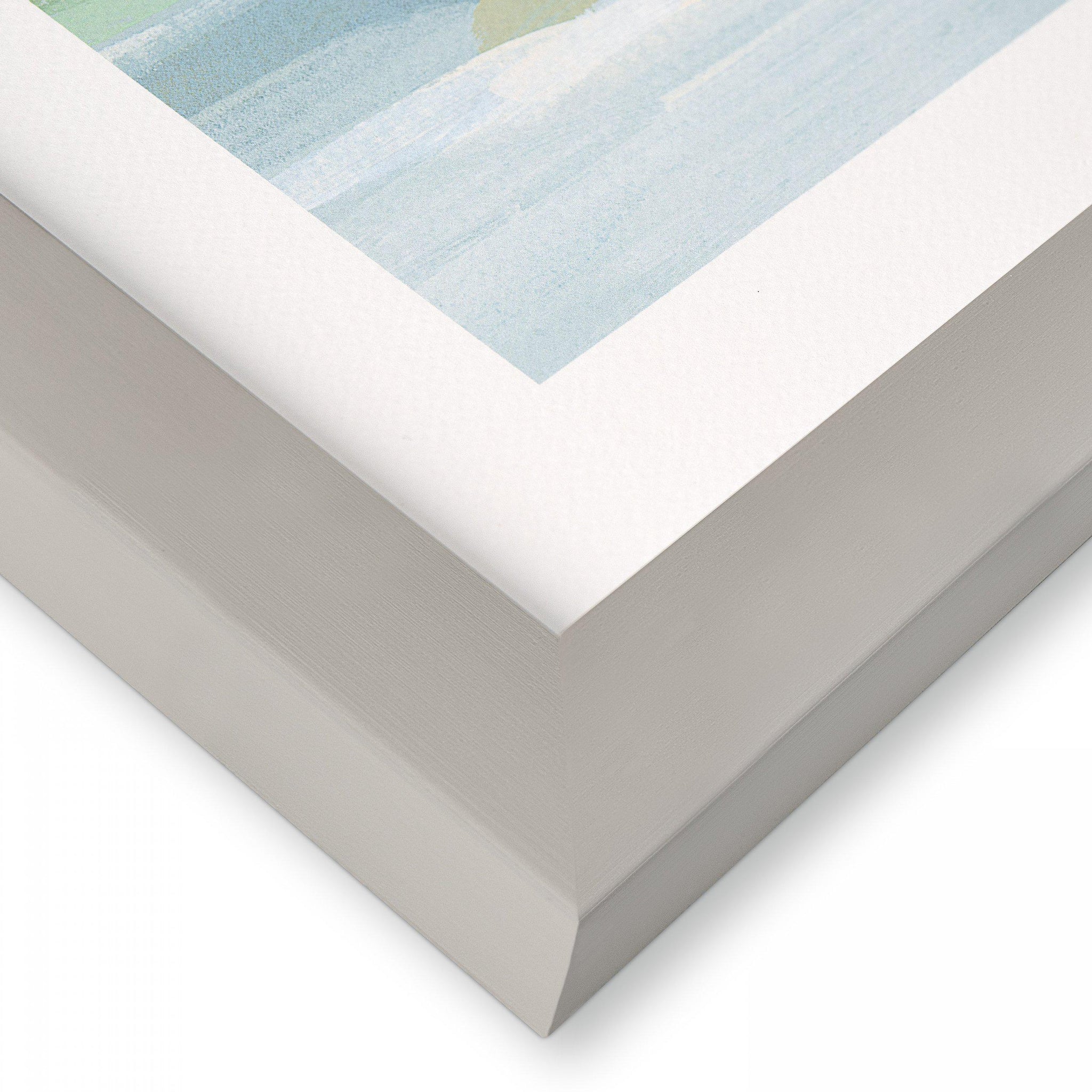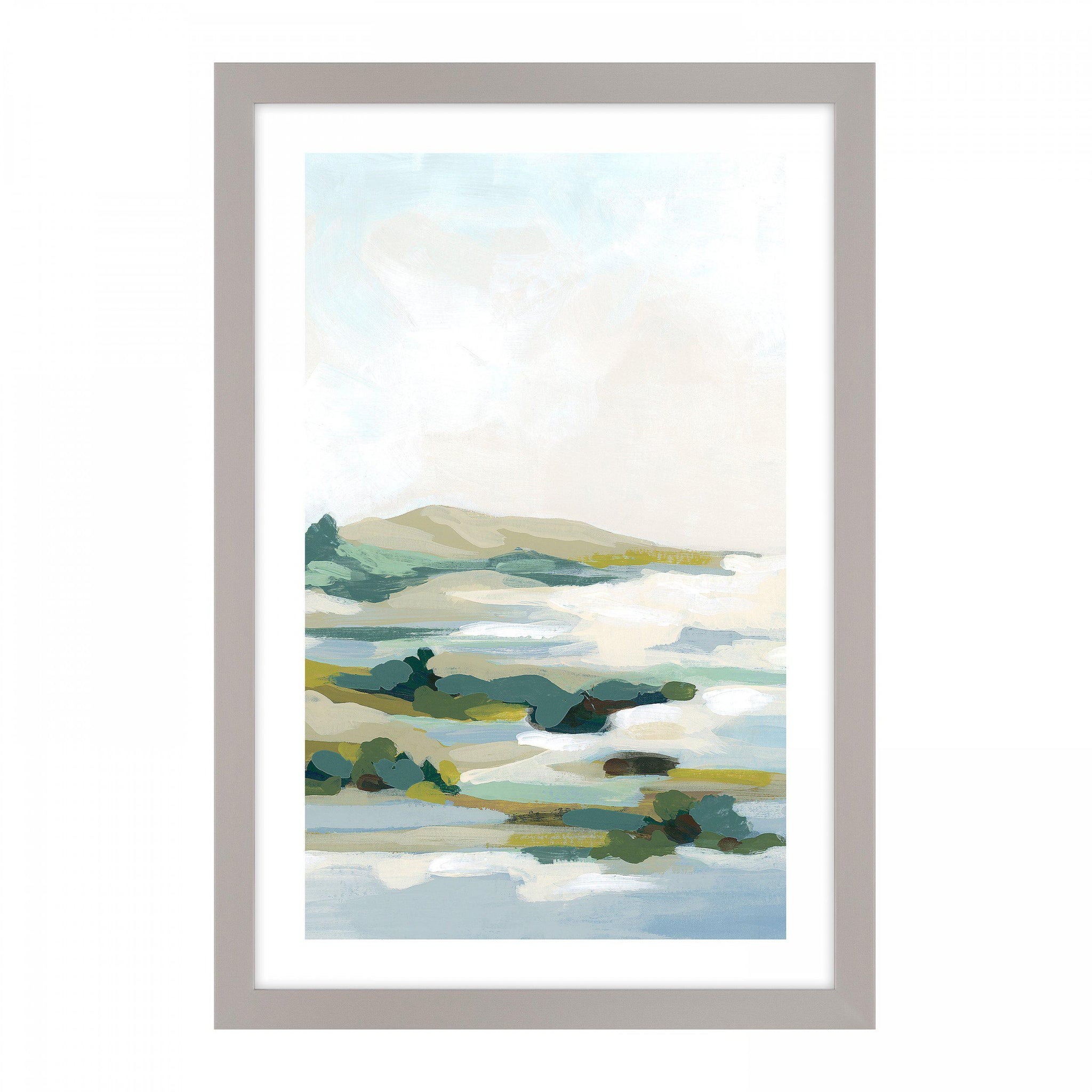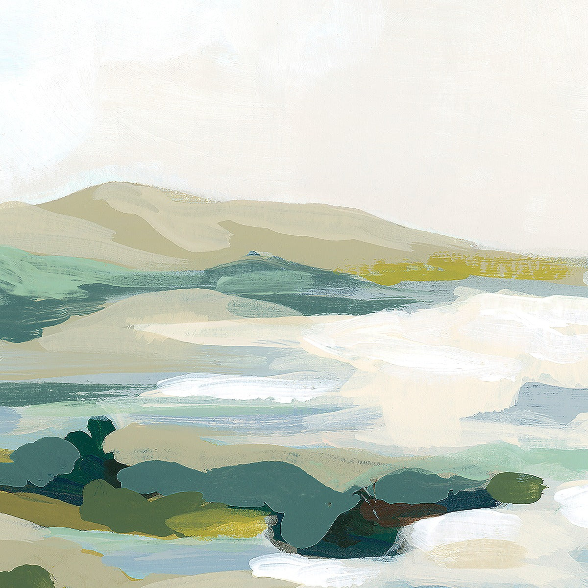A contemporary view of a rural landscape. Abstract movement forms the foundations of the terrain. There is an aura of spring. An assortment of greens and blues create a calming atmosphere. The sky is filled with fresh air while the clouds move steadily across lush green land. Presented on textured paper. Framed and glazed.