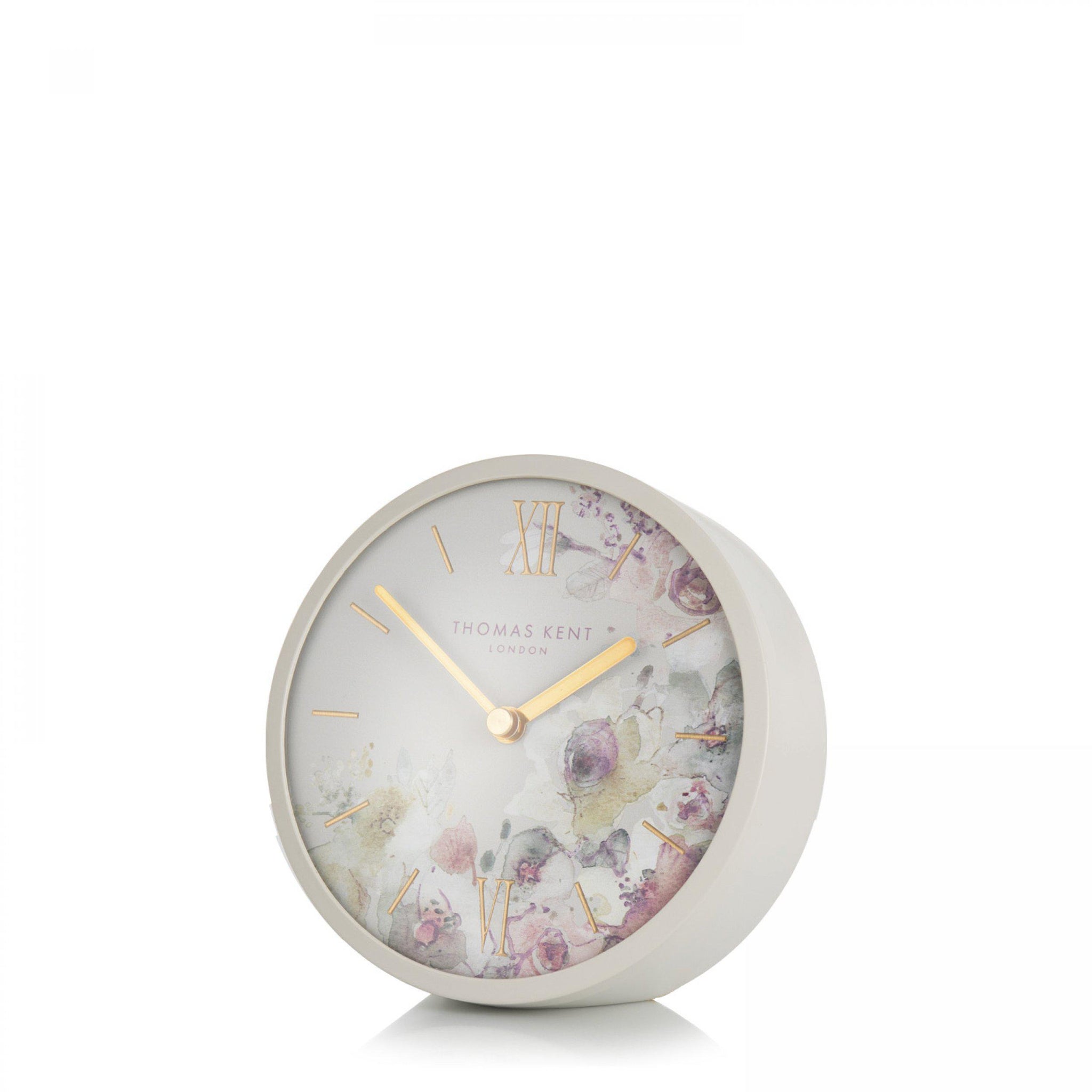 A stunningly beautiful floral timepiece. The Crofter. Taking the signature handheld Thomas Kent mantel design, and transforming it into a pretty interior accessory. A gentle shade of dove grey wraps around the dial. Gold embossed roman numerals, along with matching hands complete the small clock design.