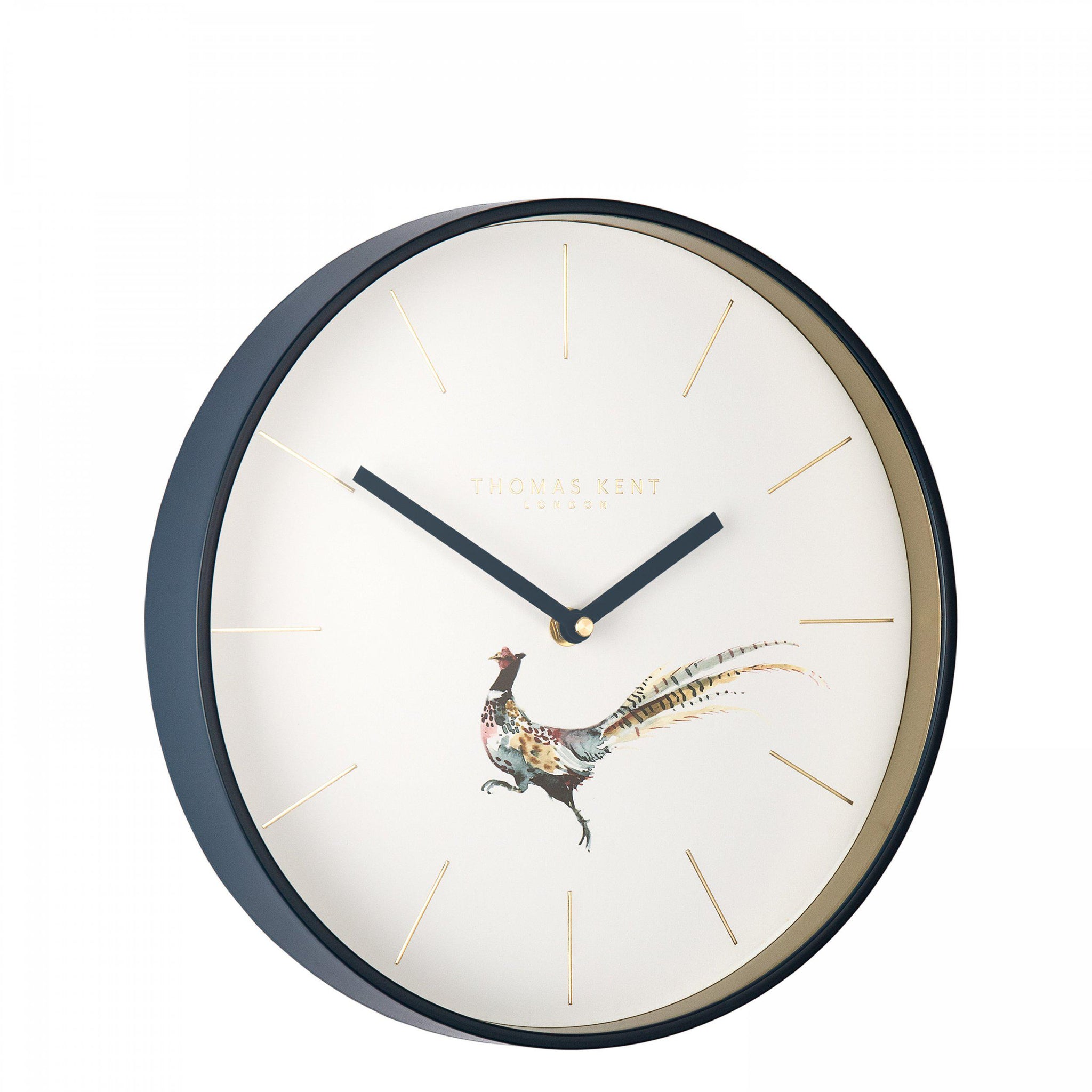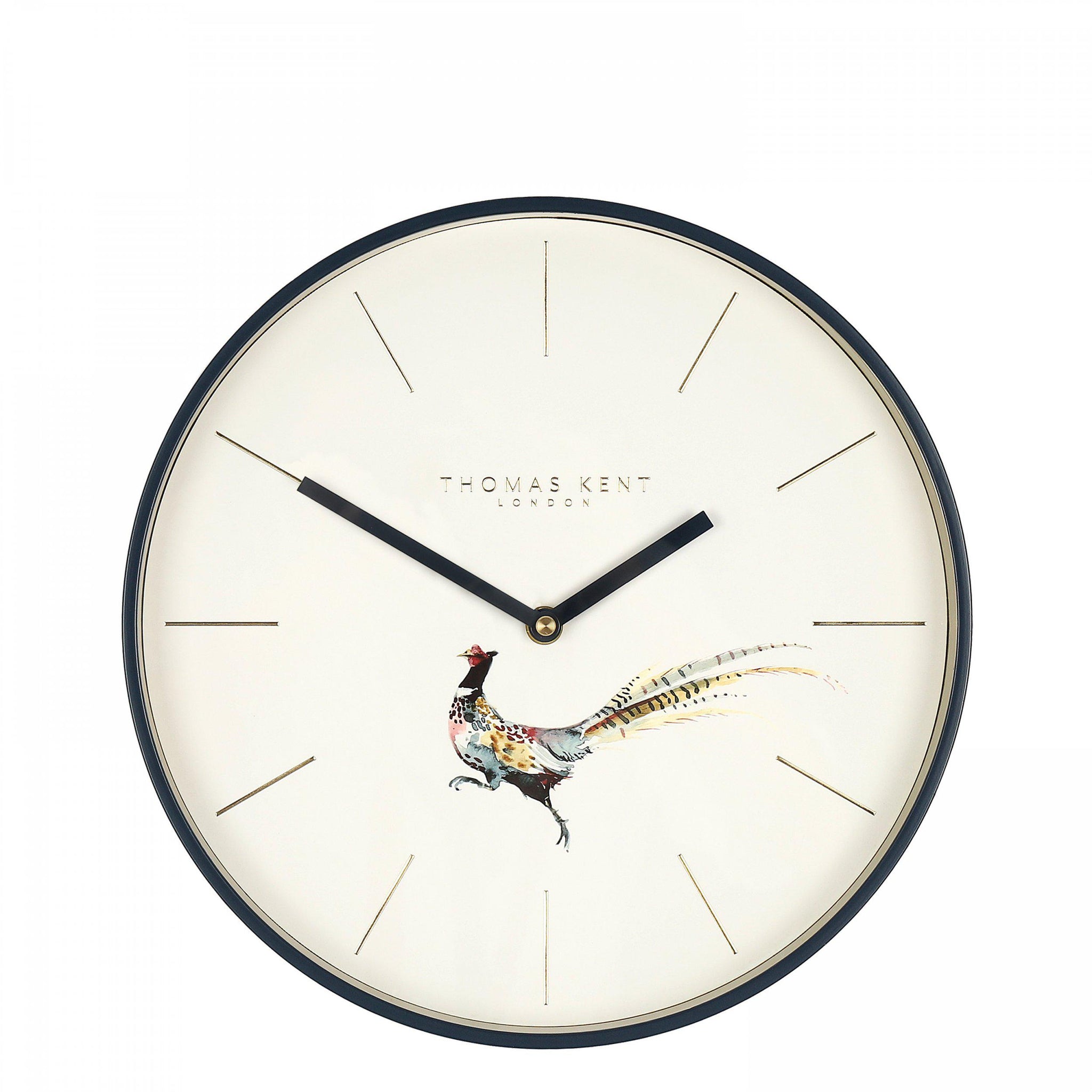 The deep navy frame and matching hands complement the wonderful colouring found on a wild pheasant's plumage. The regal bird is portayed by its very natural stance as it canters across the dial. The 16-inch wall clock boasts a gold inner bezel with gold ticks. Our Woodland Pheasant wall clock is a classic farmhouse wall accessory.