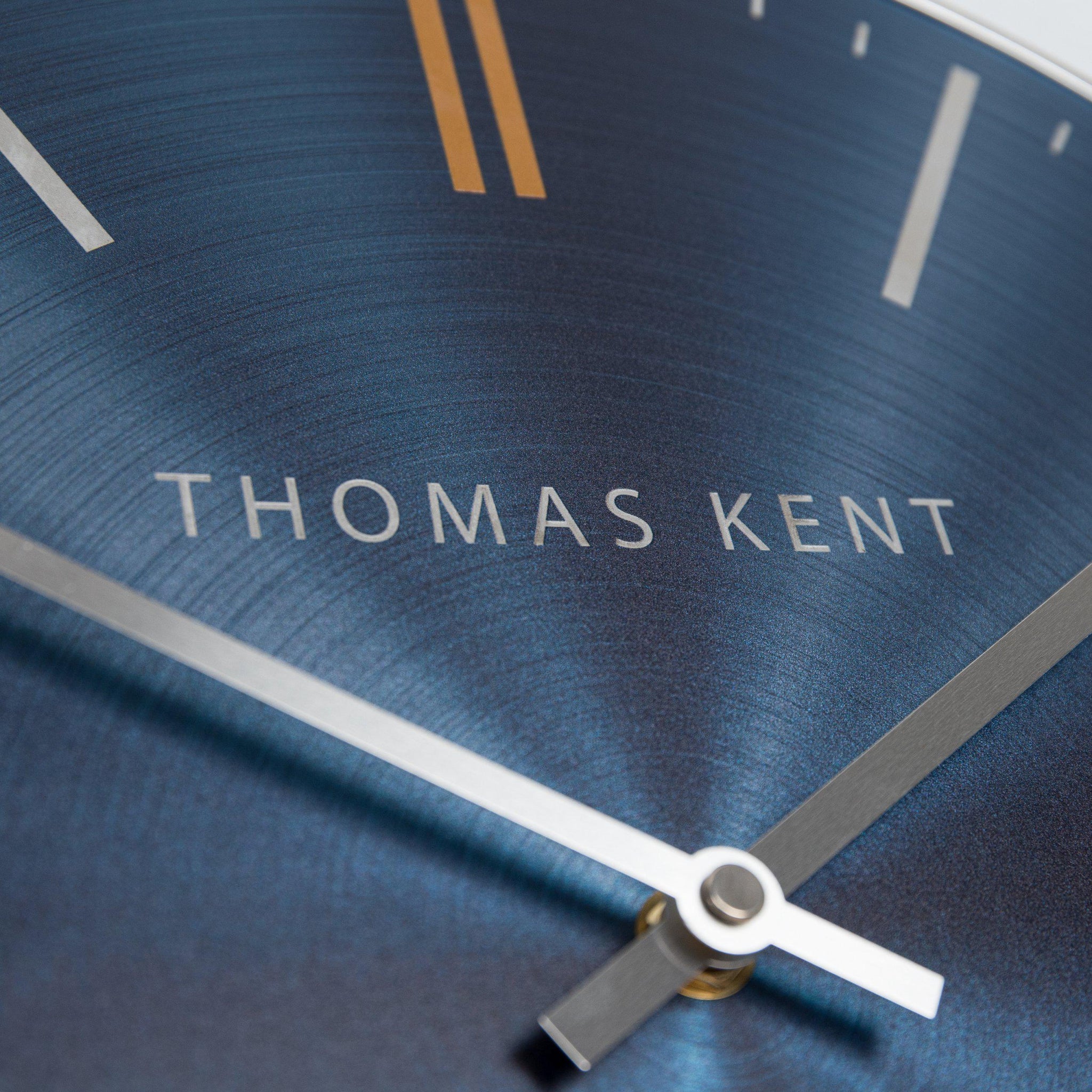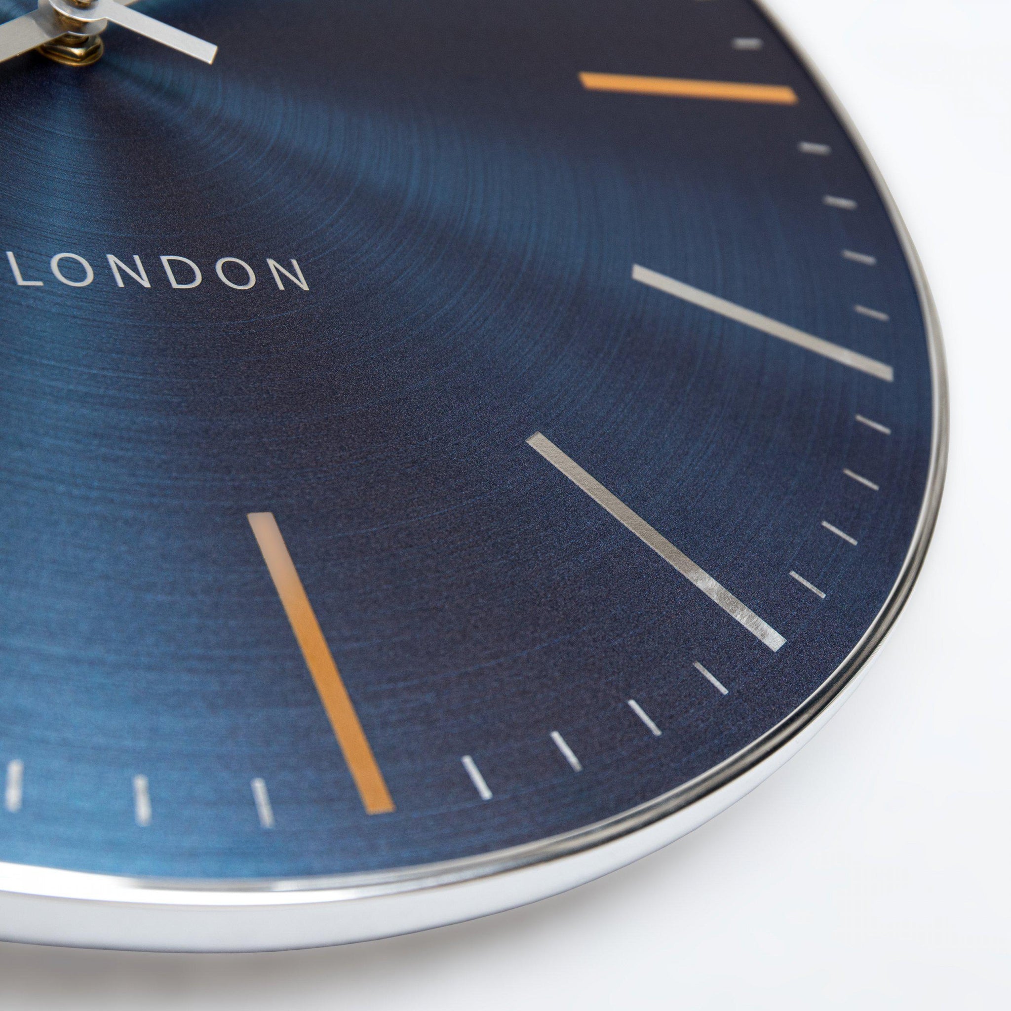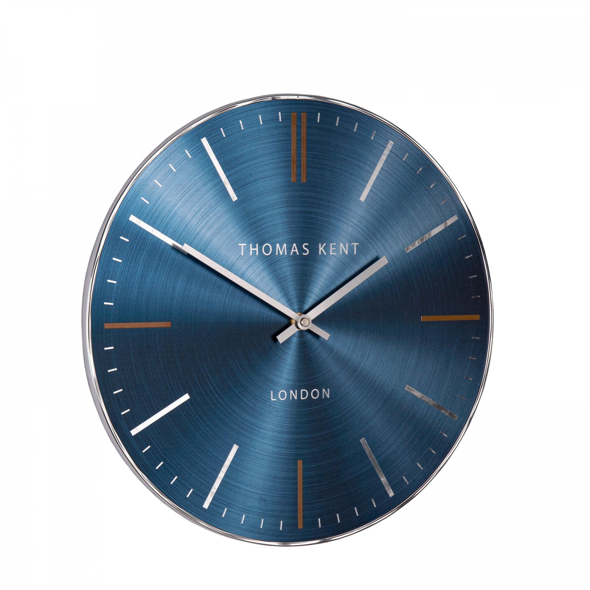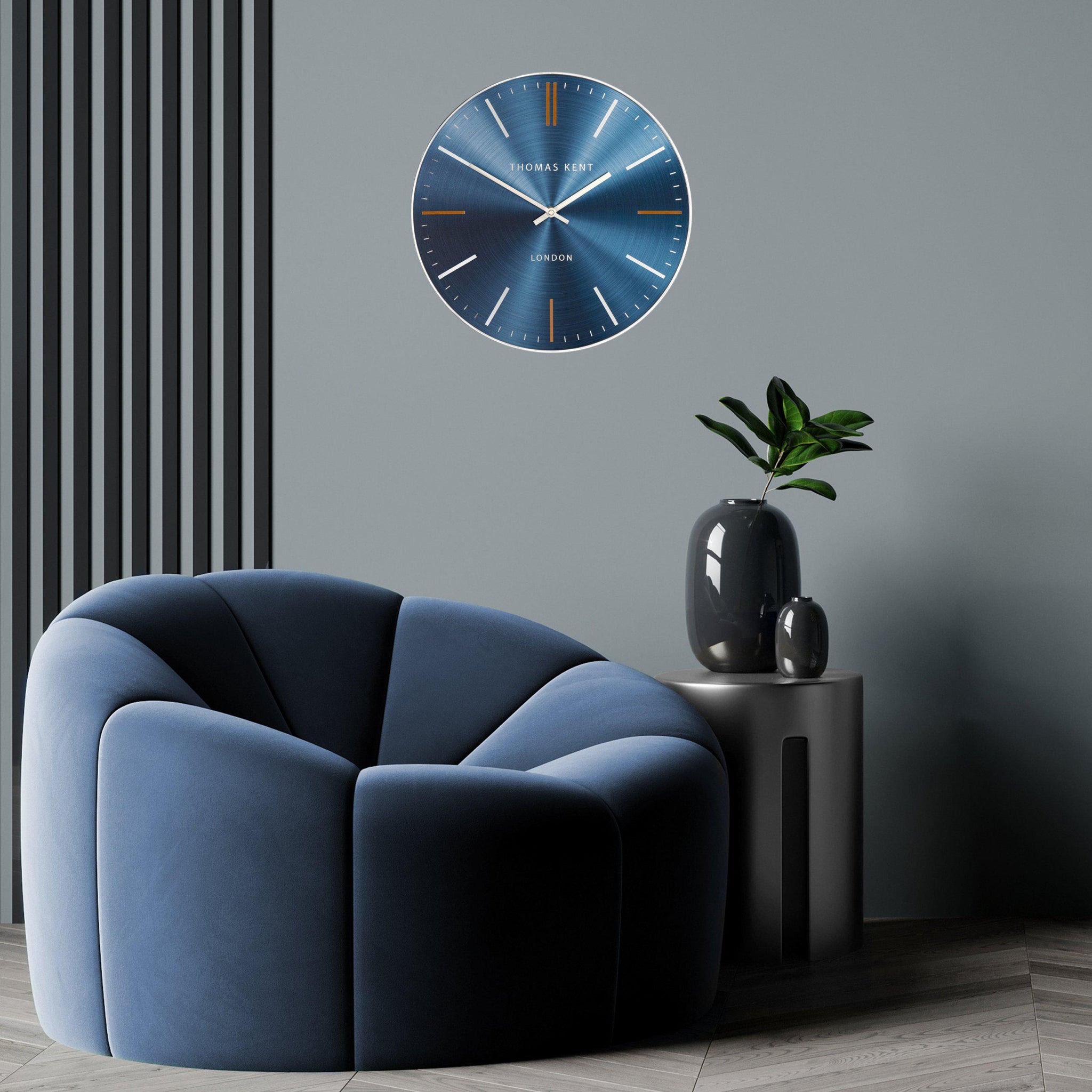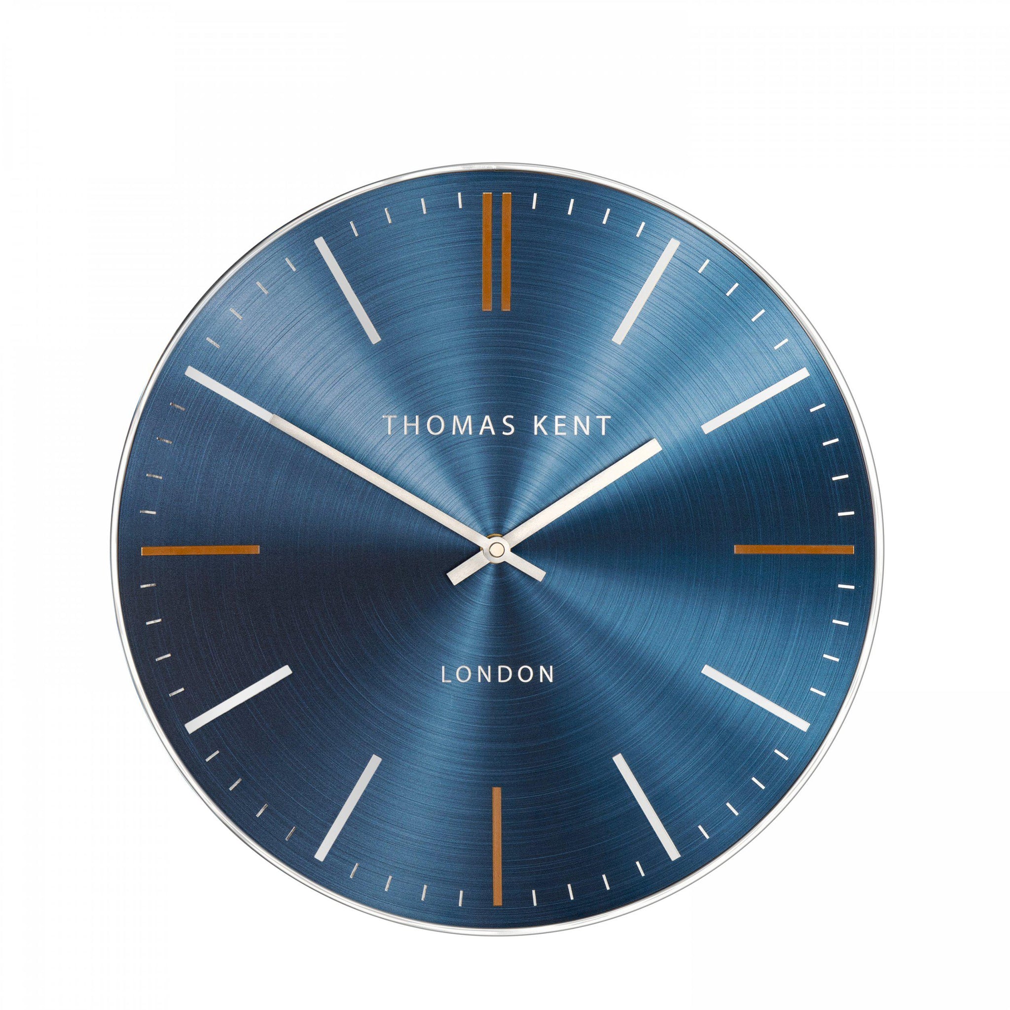 Bursting with energy, our Bistro design is bold, bright and playful. AÂ metal effect face revealing the intricacies of a spun surface orbits the dial. The electric shade of sapphire blue captures the light surrounding the wall clock, creating a dynamic face. Contrasting orange ticks, a slimline glossy metal silver rim and aluminium hands add the finishing touches to this fierce interior statement.