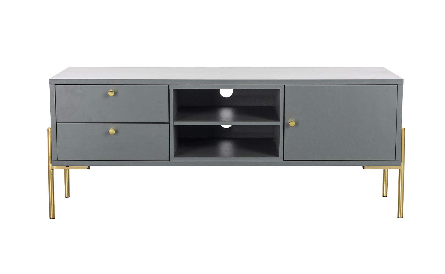 The Marbella TV Unit is a stunning piece of furniture. With natural oak melamine, powder-coated black metal legs and black hardware and accents. Also featuring two shelves perfect for holding your TV boxes or DVDs, two storage drawers and one cupboard.