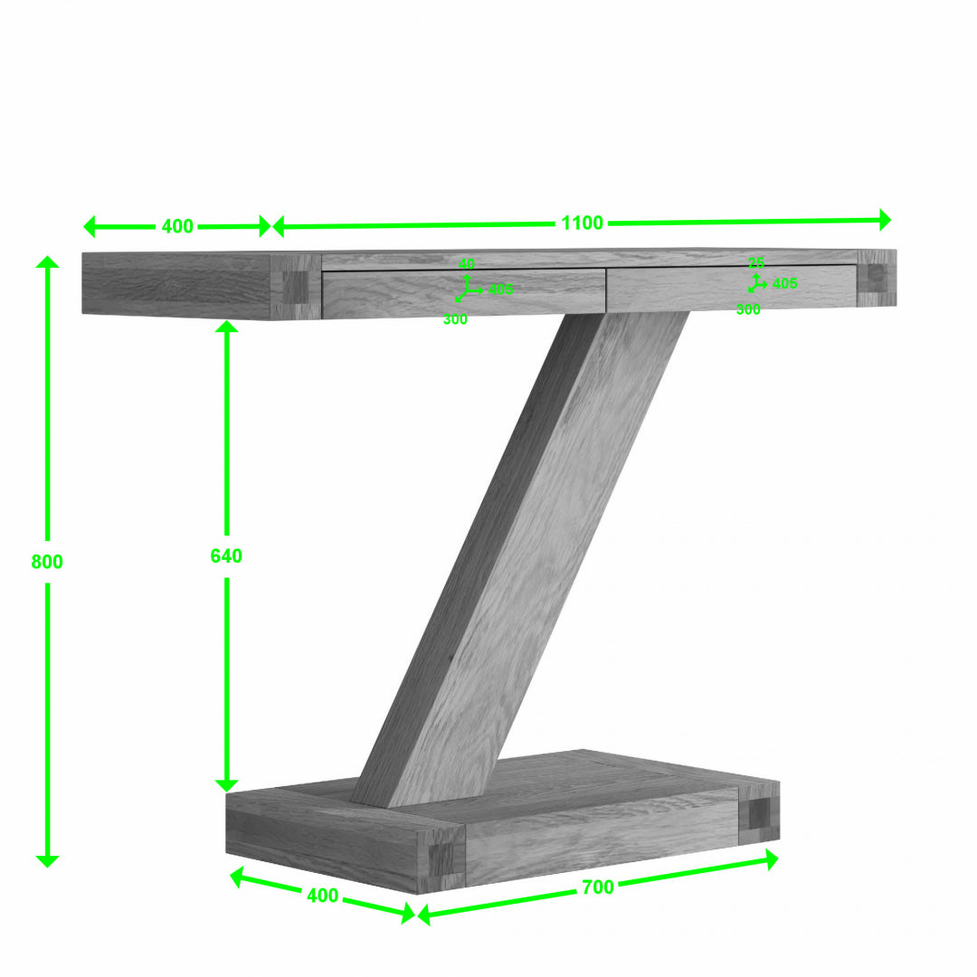 A stylish console unit based on our ‘Z’ theme with 2 pull out drawers with internal dimensions of 405 mm wide and 300 mm deep, the left drawer has an internal height of 40 mm, the right drawer 25 mm due to the base support. This is just one of several hall/console tables within the range.
