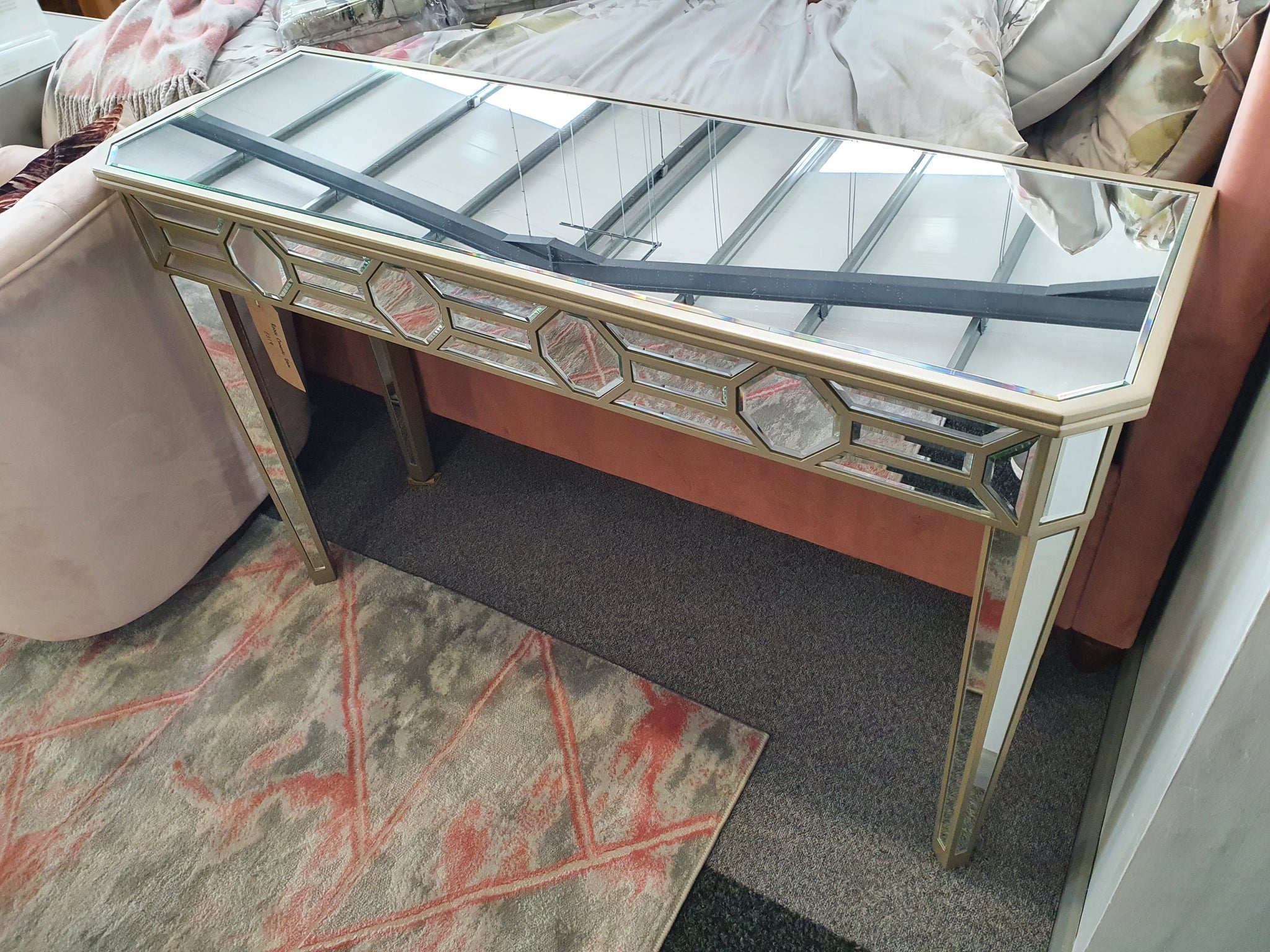 The Rossi Console Table is a stunning piece, designed to add that luxury look to your home. It's mirrored finish is given added elegance by the bronze brushed effect painted pattern.