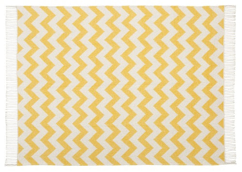 Made from soft and cosy recycled cotton yarns with an all over zig zag print. Grey tassels at the ends completes the look.